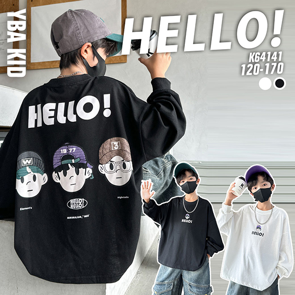 寬鬆秋款落肩HELLO!卡通人物圖案個性潮T長袖上衣(黑/白)【K64141】