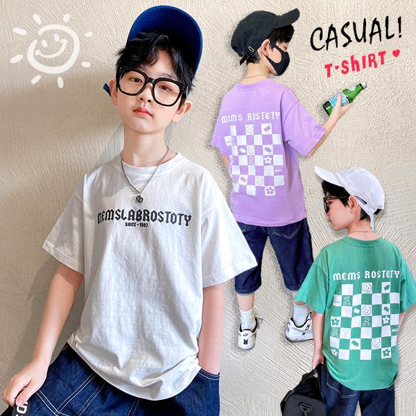 卡通棋盤格印花寬鬆短袖上衣03/29(白/紫/綠)【K51004】