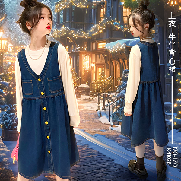 韓系春秋款甜美少女長袖襯衫連衣裙+寬鬆無袖排釦單寧牛仔背心(套裝)【K41031】