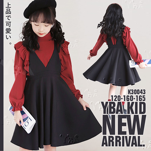 日系可愛飛袖木耳邊高領束口長袖上衣+後綁帶造型V領背帶連身長裙(紅)【K30043】