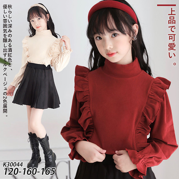 日系少女感高領荷葉木耳邊純色秋季保暖長袖上衣(米/紅)【K30044】